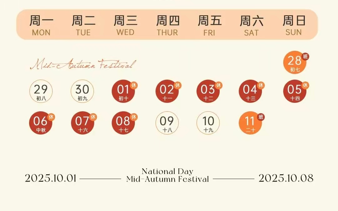 Con l'avvicinarsi della Festa di metà autunno e delle festività nazionali, cogliamo l'occasione per porgere i nostri più calorosi saluti e auguri a voi e alle vostre famiglie.